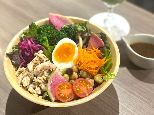グリーンリーフをベースに、ハニー&マスタードチキン・半熟卵・ビーンズ・ブロッコリー・キャロットラぺ・紅芯大根の塩麴和え・紫キャベツのマリネ・トマトをバランスよくトッピングしました。別添えにてノンオイルドレッシングをお付けします。